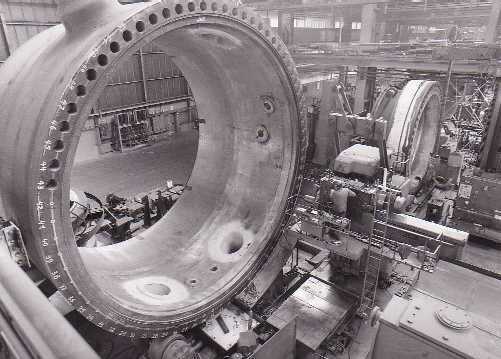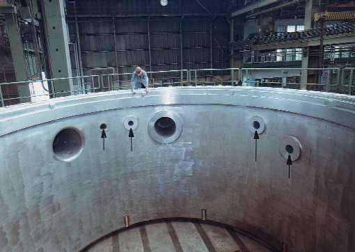 The Submerged Arc Fine Wire Weld Cladding Procedure was developed for the austenitic internal cladding of 8 nozzles on the shell flange of the "Atucha 2" RPV. In Fig. 10, arrows indicate the location of four of this nozzles. The internal diameter of them was between 196 and 348 mm, at a length of up to 970 mm. Some other welding processes had to be discarded for economic reasons (GTAW with cold wire - insufficient deposition efficiency), on geometrical grounds (manual arc - restricted space conditions), or because of increased defect frequency (GMAW).