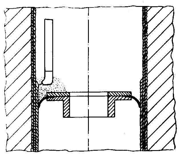 The basic approach pursued when implementing the new process is illustrated in Fig. 12. The individual beads are deposited on the vertical wall. The flux is retained by means of a special device that moves as welding progresses, and which has an opening for slag extraction in its middle.