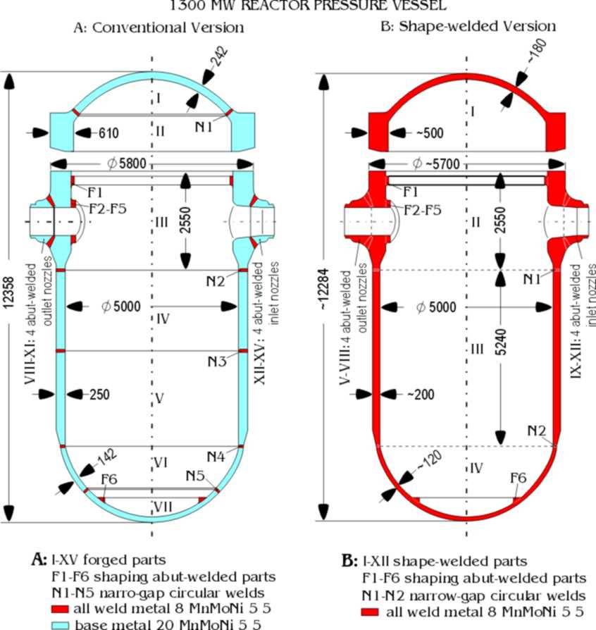 Shape-welding technique opens up a new perspective for designing heavy nuclear components mainly with a view to realizing the idea of “seamless components” of any size. This point is illustrated in Fig. 26, based on the example of a 1300 MW reactor pressure vessel.